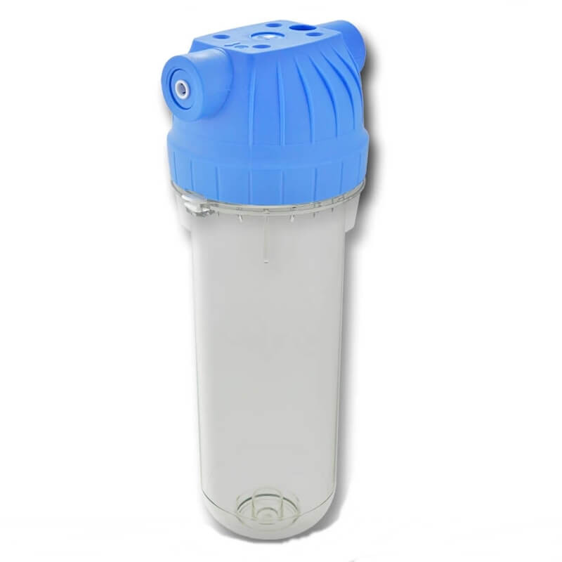 Háztartási USTM víztisztító berendezéseknél ( FS2-EMI, FS3-EMI) használatos műanyag szűrőház dupla tömítő "O"-gyűrűs kivitelben, átlátszó házzal, kék szűrőház fejjel. 10" méretű szűrőbetétek valók bele.
